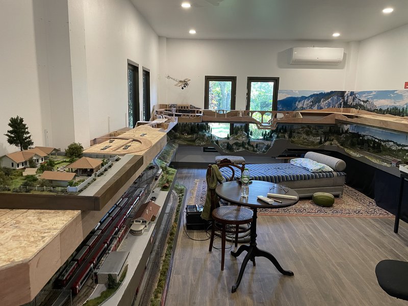 Richtig schöner Raum für eine derartige Zwei Etagen Anlage. Hoffentlich hattest du noch reichlich Fahrzeuge aus deiner Sammlung übrig😎