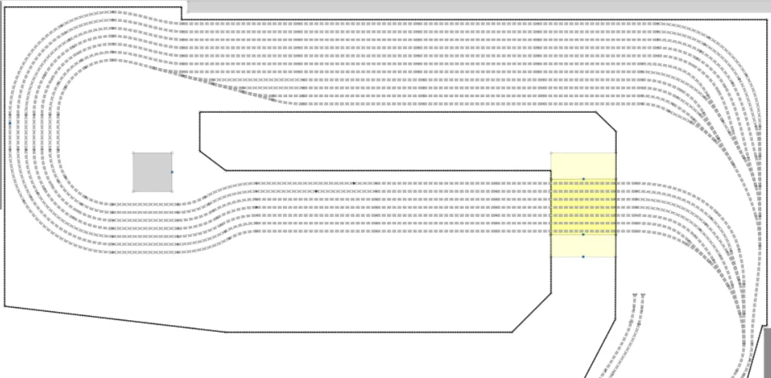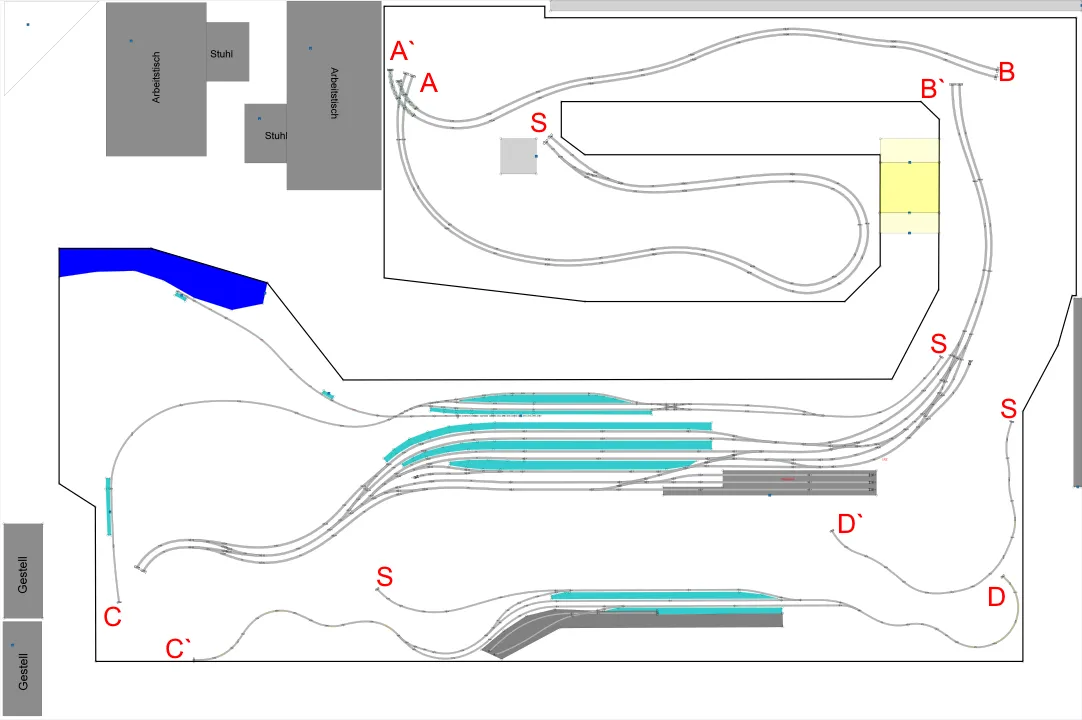 Beim S im oberen Bereich kommt die zweispurige Hauptstrecke aus dem Schattenbahnhof heraus und windet sich durch Weinreben in Richtung A. Die Landschaft soll so gestaltet werden, dass aus den Gängen heraus nur ein Trasse sichtbar ist. Die Strecke soll sich daher um die Landschaft herum drehen. Im unteren Teil befindet sich der grosse Hauptbahnhof mit der Möglichkeit für sanfte Rangiermanöver, zum Beispiel stärken und schwächen von FLIRT oder GTW eventuell auch einzelne Wagen per Rangierlok.