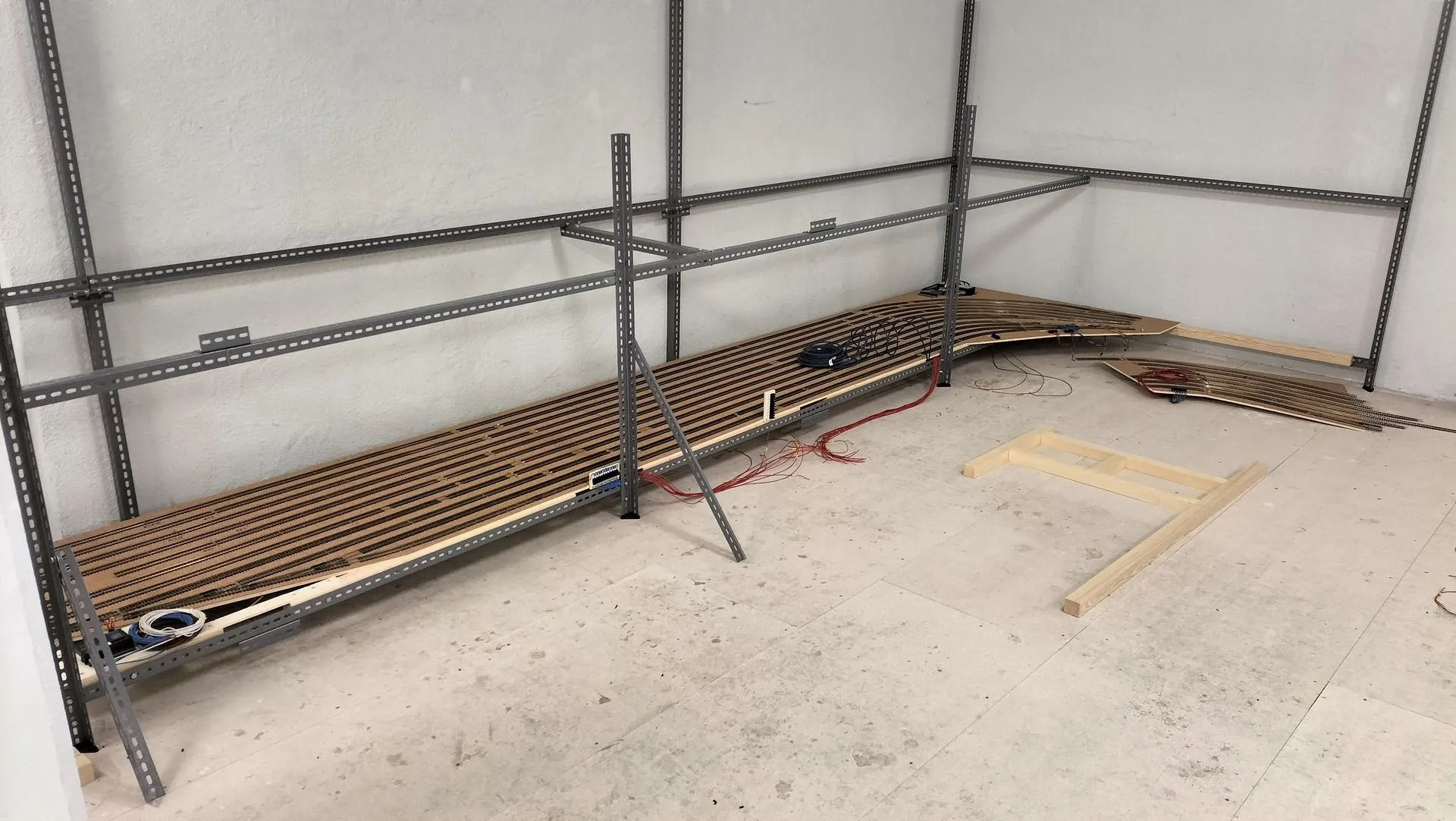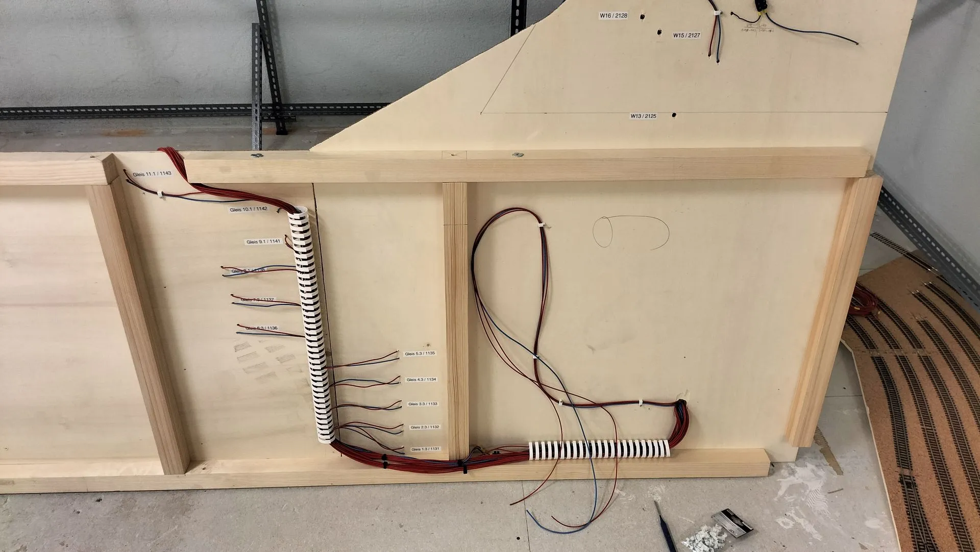 Im folgenden die ersten paar Bilder des Baus. Angefangen beim oberen Schattenbahnhof, der total 25 Züge fasst. 7 Gleise in drei Blöcken, wobei sich der letzte Block auf 11 Gleise erweitert. Ja das ist gross, mit meinem zur Zeit vorhandenen Rollmaterial wird dieser Schattenbahnhof aber bereits knapp gefüllt sein. Schliesslich will ich noch Rollmaterial erweitern können und trotzdem den zweiten Schattenbahnhof am anderen Anlagenende nicht direkt gefüllt haben.