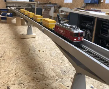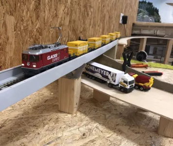 Mein Hinterrheinbrücke, die Sova Giruvna konnte mal soweit zusammengebaut werden das man erahnen kann, wie gross die Schlussendlich wird. Nicht ganz Original länge, aber trotzdem stolze 240cm lang. Jetzt kommen dann noch ganz viele Details dazu. Brückengeländer, Fahrdrahtmasten usw... Aber es macht schon viel Spass mit einem kompletten AGZ, und Allegra da drüber zu fahren. Heute konnte ich auch schon einmal mit der Autobahn darunter anfangen