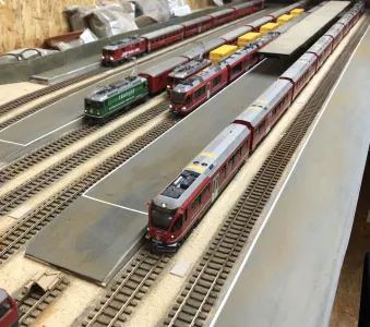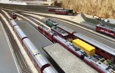 St.Moritz heisst der bei mir. Hat ausser das es ein klassischer Kopfbahnhof ist, so gar nichts mit dem richtigen St.Moritz zu tun. Ist ein Bahnhof frei nach Fantasie, aber halt im RhB Style. Ich bin mir noch am überlegen ob ich die Perrondächer nach der neuen RhB-Bauweise erstellen soll, oder ob ich mir da sogar eine künstlerische Freiheit erlauben soll und was ganz gewagtes machen. Mir schwirrt da zum Beispiel die Perrondächer des Hauptbahnhofes in Wien vor...